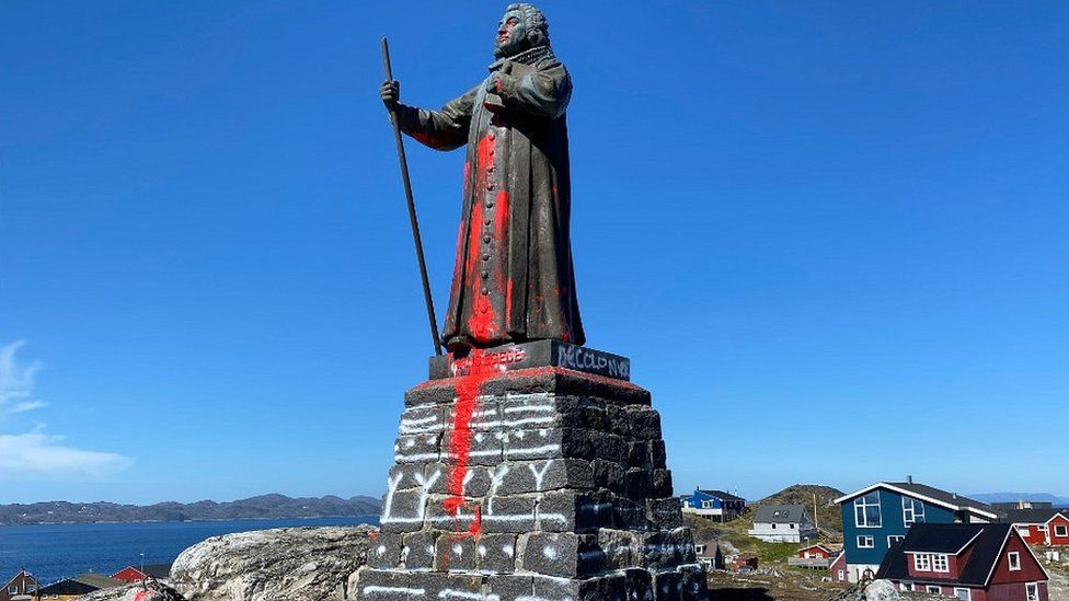 In Nuuk there are two statues; standing on a high hill is a statue of the Danish-Norwegian missionary Hans Egede, in clerical dress and ruff. The statue of Egede is regularly vandalised.