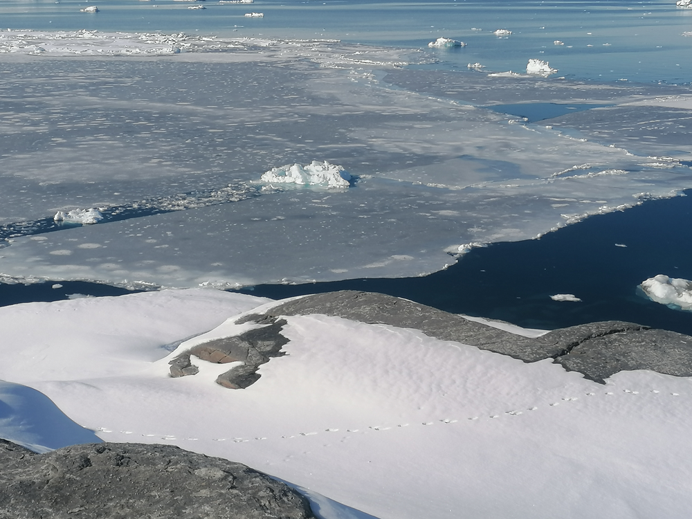 Below there are tiny footprints crossing the snow, probably from an Arctic fox.