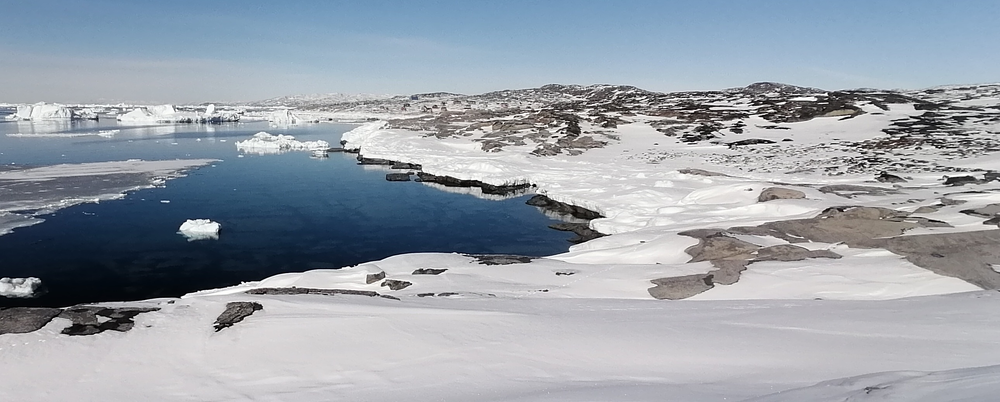 Oqaastut looks tiny against the landscape. Here on the rocks I set up camp for a couple of hours and draw – not particularly good, but at least I try and it's part of the way of absorbing the place and remembering.