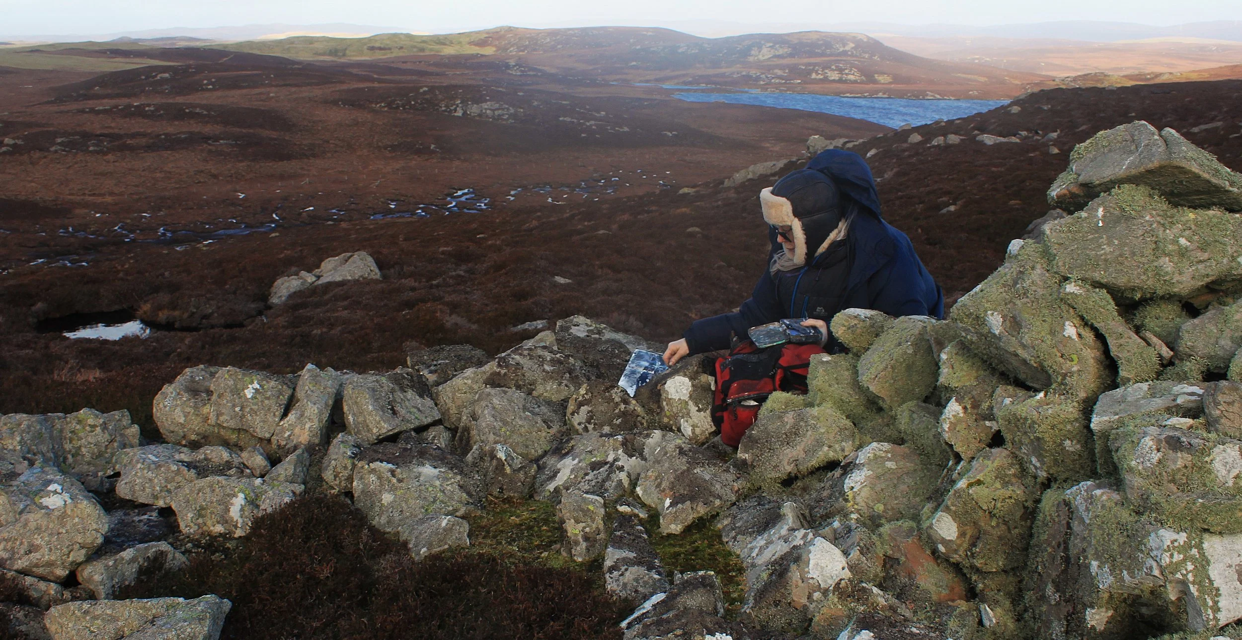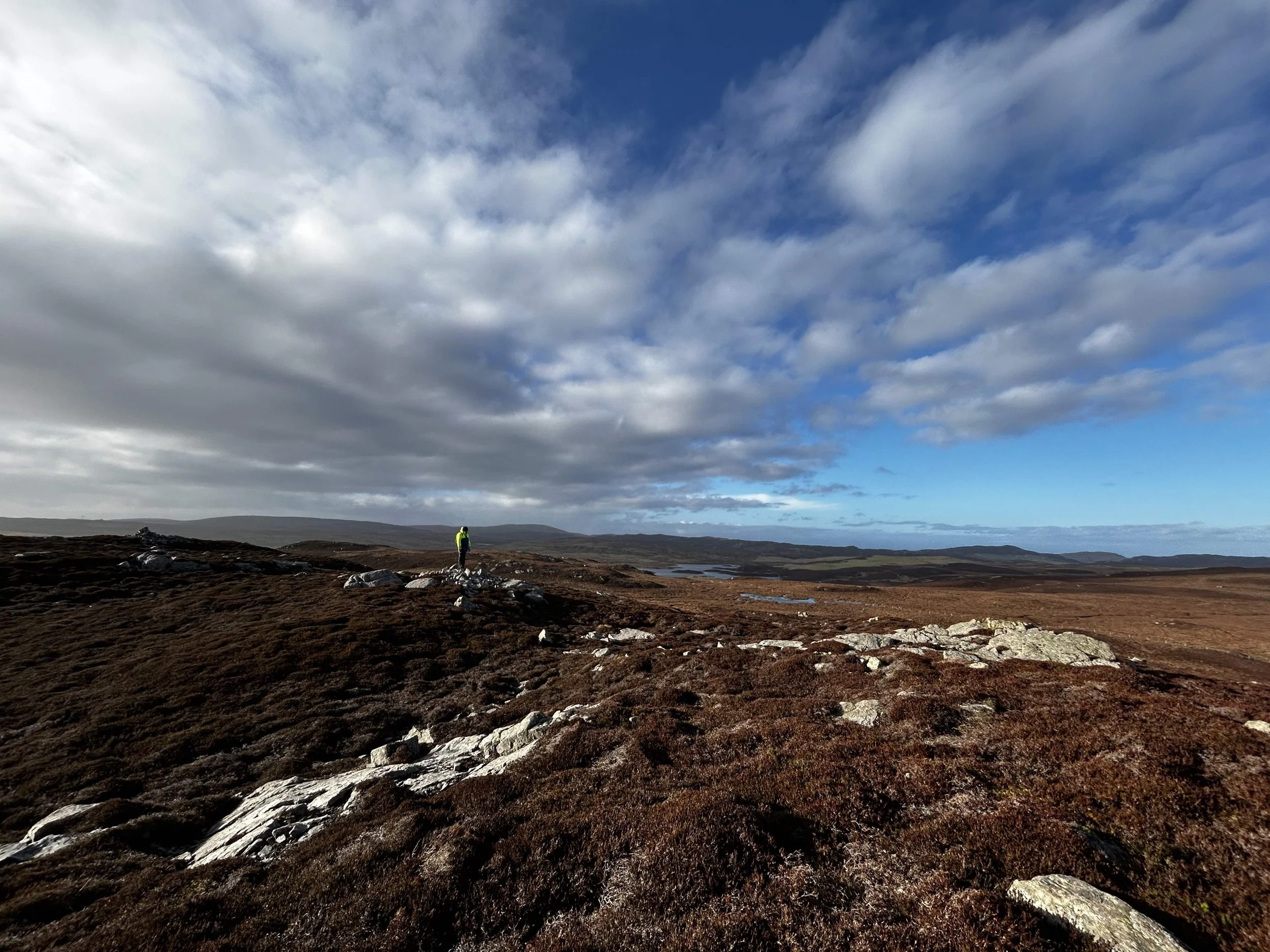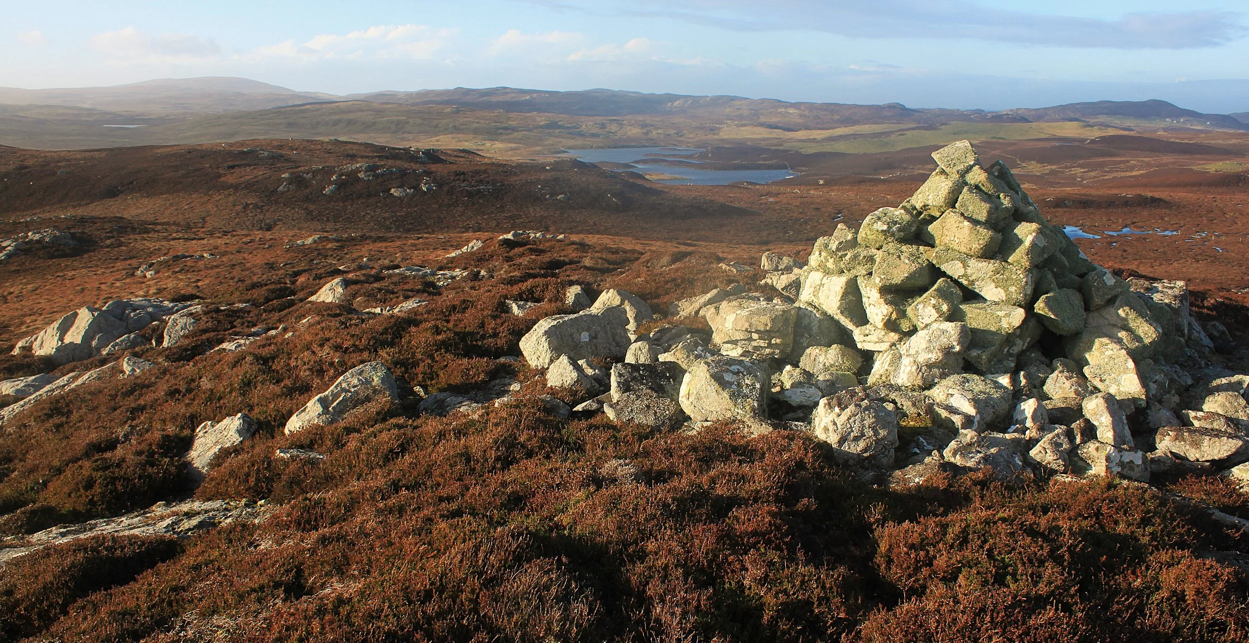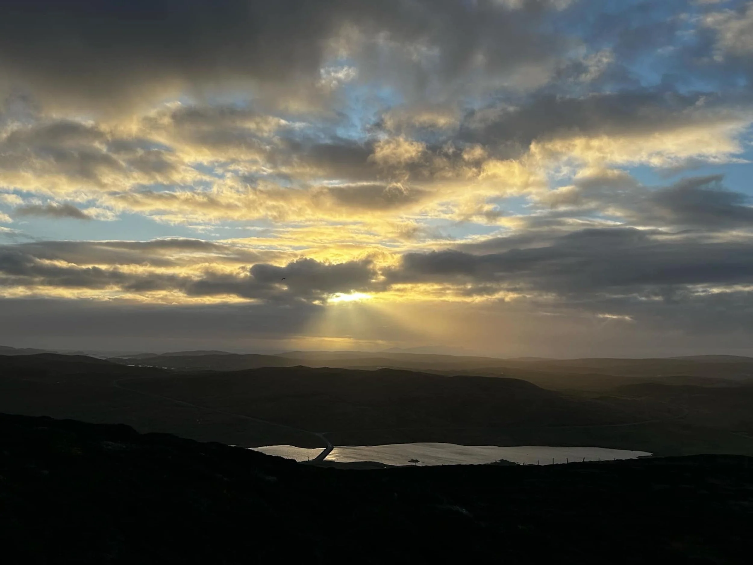 Out of the wind sheltered by the cairn, we look out from our high vantage point. The sun starts to set, glinting on the distant loch; I can just pick out the Bridge of Walls and the road beyond lost in the haze.