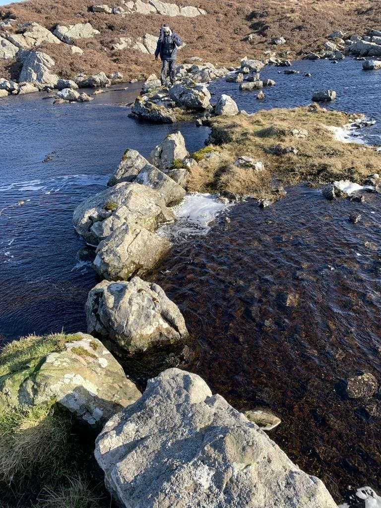 The old map marks a sheepfold and a rather handy line of stepping stones crossing the loch and fortunately they’re still there – in the form of a pile of variously shaped rocks (I wouldn’t have called them stones). By various means and with a bit of encouragement, we all manage to scramble across, saving ourselves a longer walk around the loch.