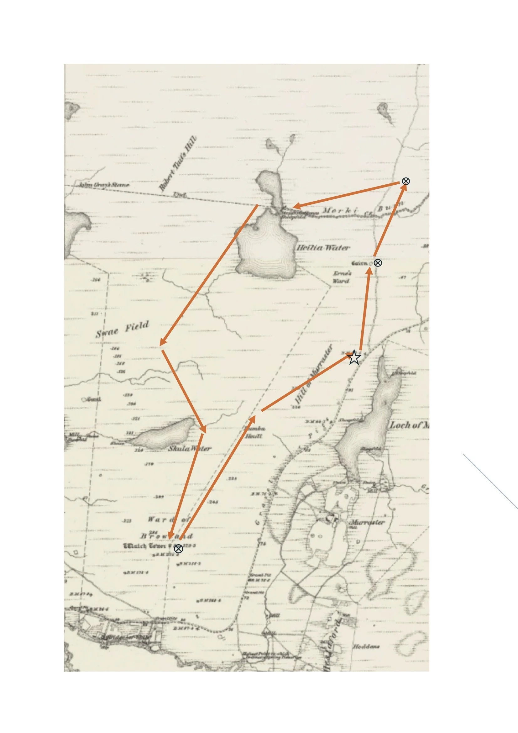 1878 first edition map showing our route and cairns. The star shows our starting and end points, the X in a circle shows the position of the cairns