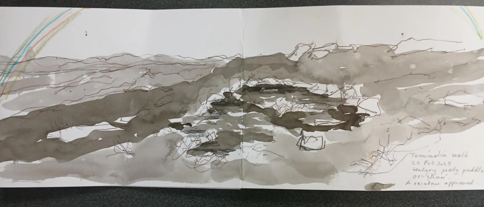 Jim Sutherland: Plein-air drawing with rainbow from Swae Field
