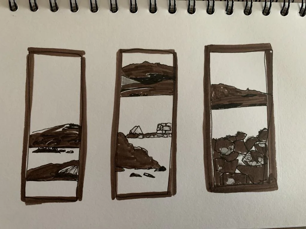 Another refreshment and drawing pause. It’s such a wild wind-swept place; we have to hunker down, level with the heather to hear ourselves speak. From here we look North across the hills to Muckle Roe and, in the distance beyond that, the curved outline of Ronas Hill. To our West lies Sandness Hill, the scattered hillside houses of Fogrigarth to the right of it, and Bridge of Walls to the South. Of course, this is the way we are accustomed to reading the landscape, rather than the way we’ve been learning to read it today.