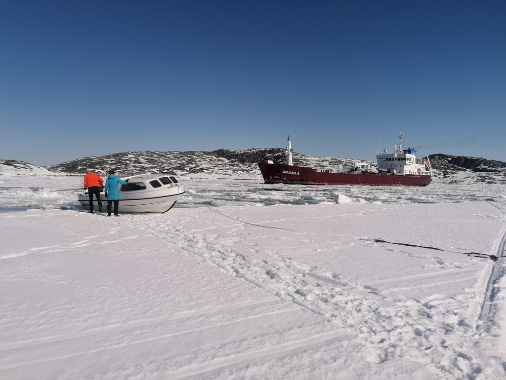 Small fishing boats wrestle their way through the maze of ice in the harbour, pushing the chunks out of the way, riding in and over them to get out of the harbour. I walk across the ice to where Andreas has his boat and watch while they try to leave, but it’s no go; there’s just too much ice on this side, so they abandon it and hitch a ride with another boat.