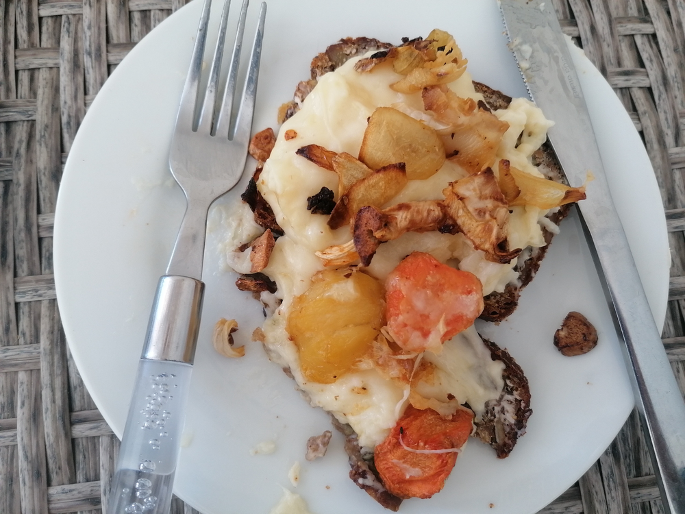 Not sure what is happening to my eating habits here – for lunch I have cheese sauce made with potato flour on bread with last night’s left over roast veg – potato carrot onion cabbage. I put it down to the limited selection of material to work with here, rather than my slovenly cooking.