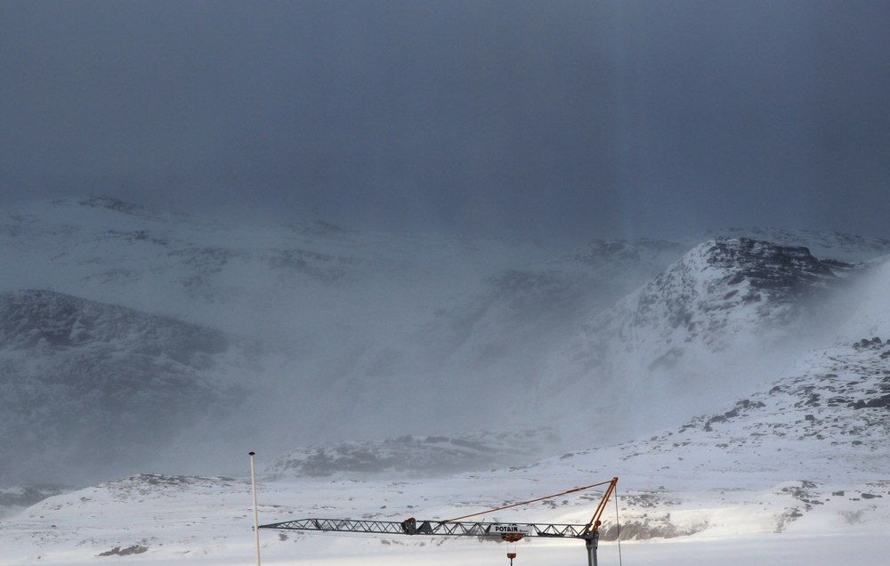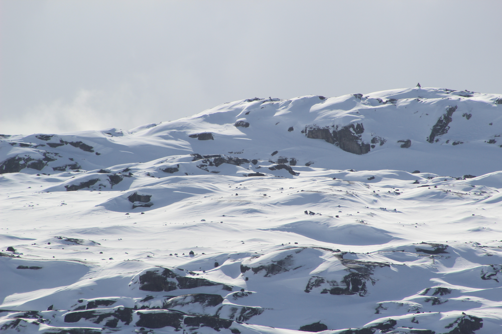 The snow is quite deep after a couple of recent snowstorms, but there is enough rock still exposed to help avoid most of the deep bits. I trudge past the small graveyard and then climb upwards, following the footsteps of others (or are they mine?) There’s a small section of rope to grab that helps with the more vertical incline (and descent). I follow the faint tracks from a sledge that has passed this way, then veer off and make for a pile of stones above me. Reaching it I can see other stone markers indicating a kind of route or at least something to aim for, so I negotiate my way round the snow trying to keep to the rocks and where I cross the white expanses check the depth of snow with my pole – I don’t want any nasty surprises when I’m up there on my own. I pause; Oqatsuut is looking smaller below me. The sounds of dogs drifts up and I can see a few people wandering around. I make it up to a large stone cairn and sit down.