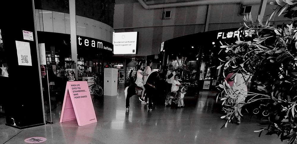 We reach a vast anonymous drab grey structure; in the midst of this non-place, inside here is a shopping mall. We enter and feel bewildered by the normality of life, the lack of masked figures, families sitting in cafes, friends wandering from shop to shop, car parks full of cars, the signs of happy consumption. Where have they all come from? We scuttle into the brightly lit vinmonopoly and buy our alcohol.