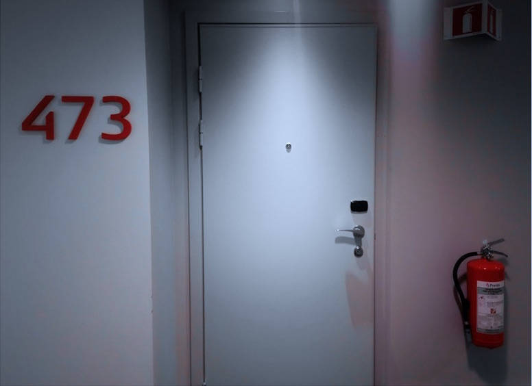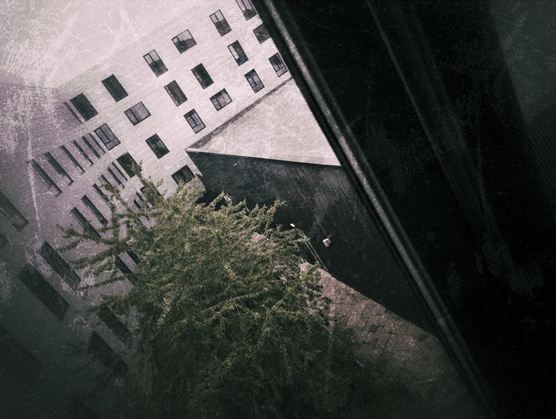 On the fourth floor, our window looks down onto a pale grey metal roof, a narrow path running between, bordered by a few shrubs and an unkempt tree. Opposite is a uniform face of white concrete walls with dark windows. The only way we know other people are behind them is that those occupied have the only slightly-opening window pulled open.