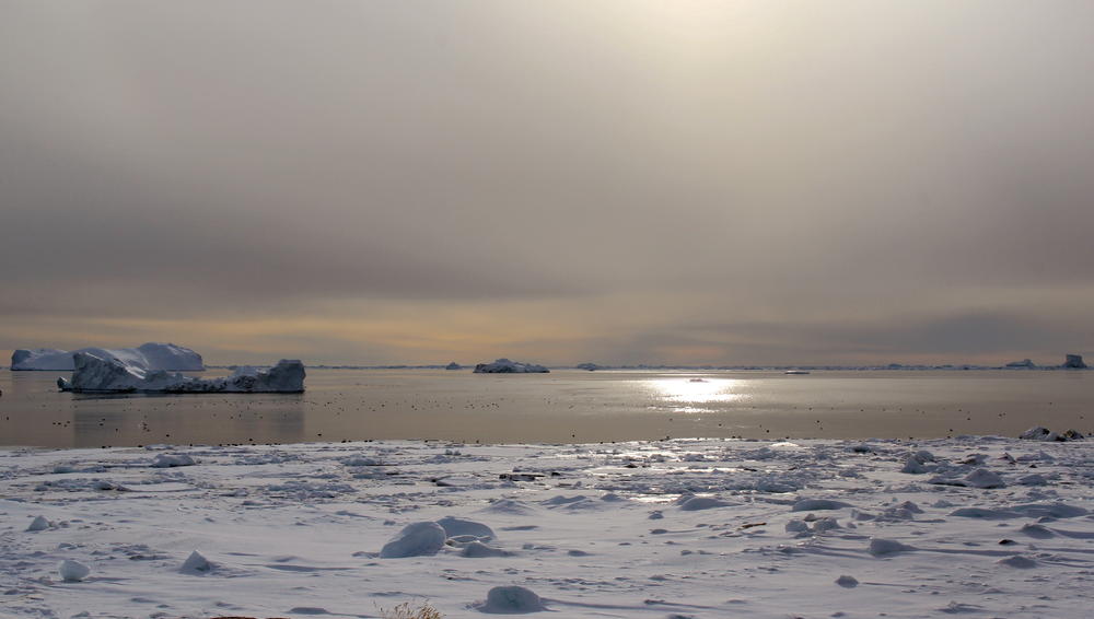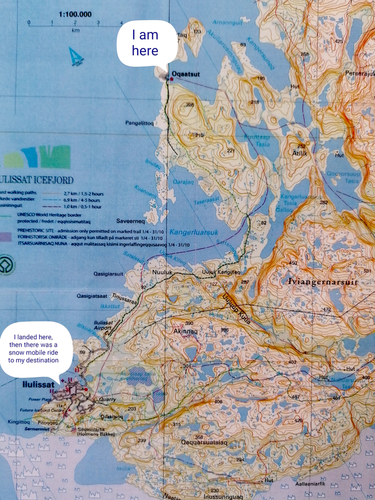 Thought that I’d show you where I am on the map: The route for walking or snow mobile from Illulissat to Oqaatsut is shown as the black broken line, so you can see where it crosses the sea ice in sections. I’m on a peninsular far from any roads (there are very few roads in Greenland).
