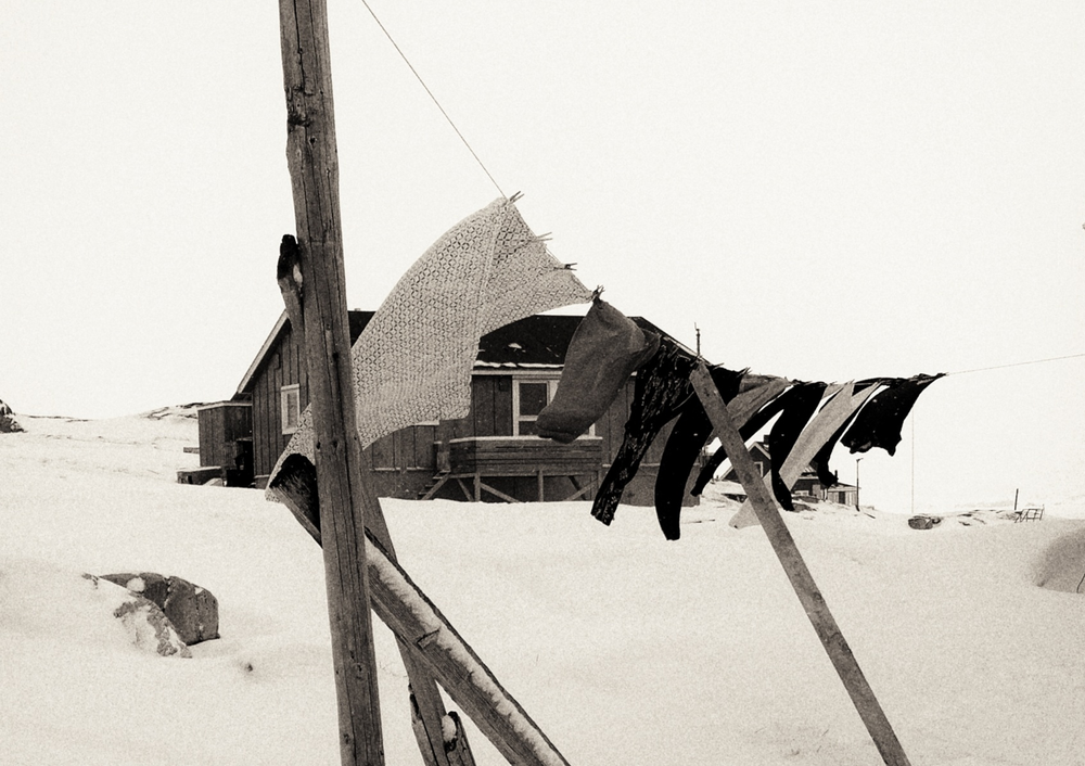 The landscape continues to disappear. I can see the world of Oqatsuut go by from this window. I watch people arriving to fill water cans, wandering in circles talking on mobile phones, sauntering past, walking from one house to another, maybe off to the shop. A small boy in a blue snowsuit is pushing a sledge back and forwards outside the window, pausing to crack his whip now and again. Despite the fact that it’s still snowing someone has their washing out on a line, blowing stiffly in the breeze; maybe it’s a smart way to clean it and saves going to the laundry.
