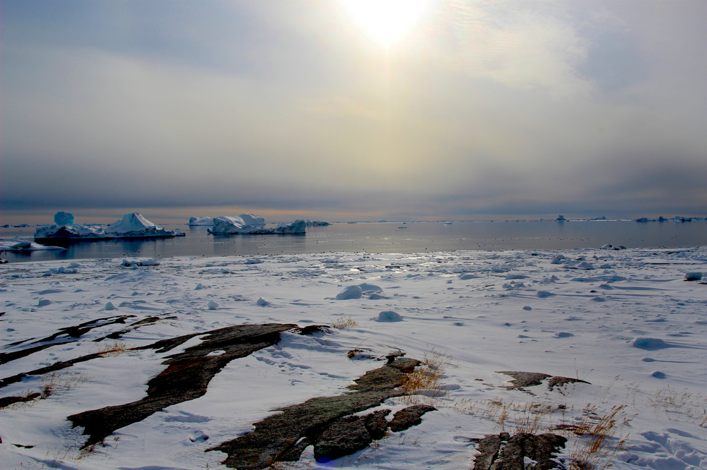 The sun is here to day, it’s stopped snowing, and now (midday) it’s suddenly +1.3C and counting. The light is pretty amazing; blue sky, and the bay looks freer of ice, apart from the huge floating icebergs.