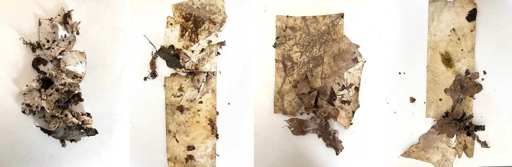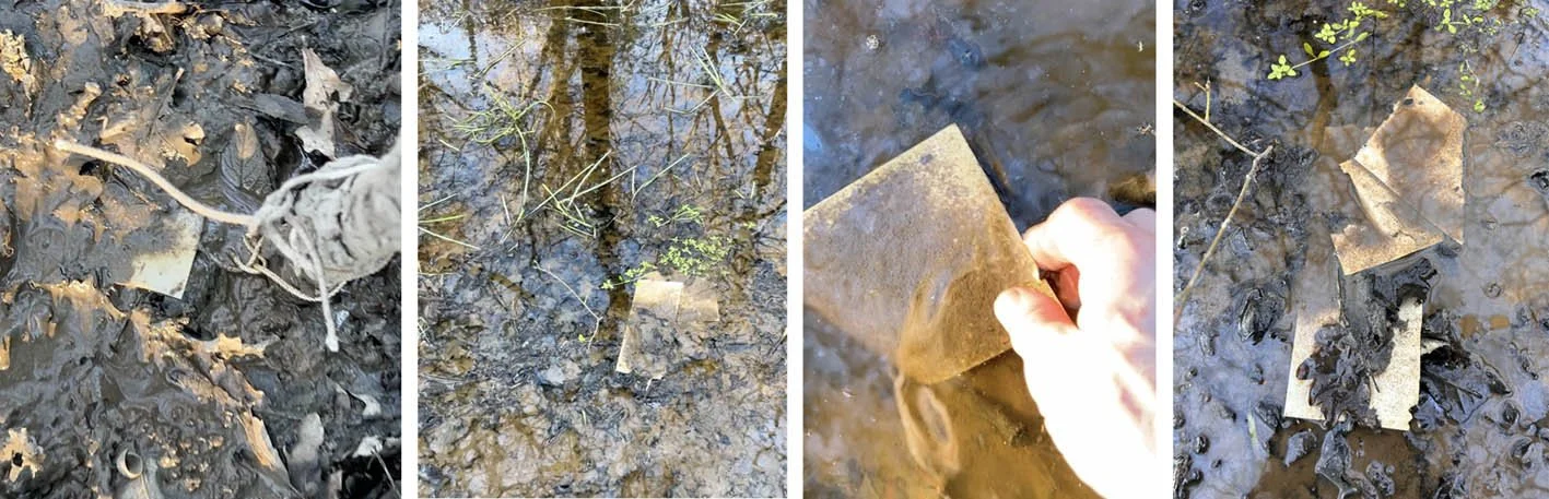 I float a strip of watercolour paper in the pond, pushing and pulling it through the mud, then bury it in earth and leaves on the bank, and wonder if it will still be there when I return?