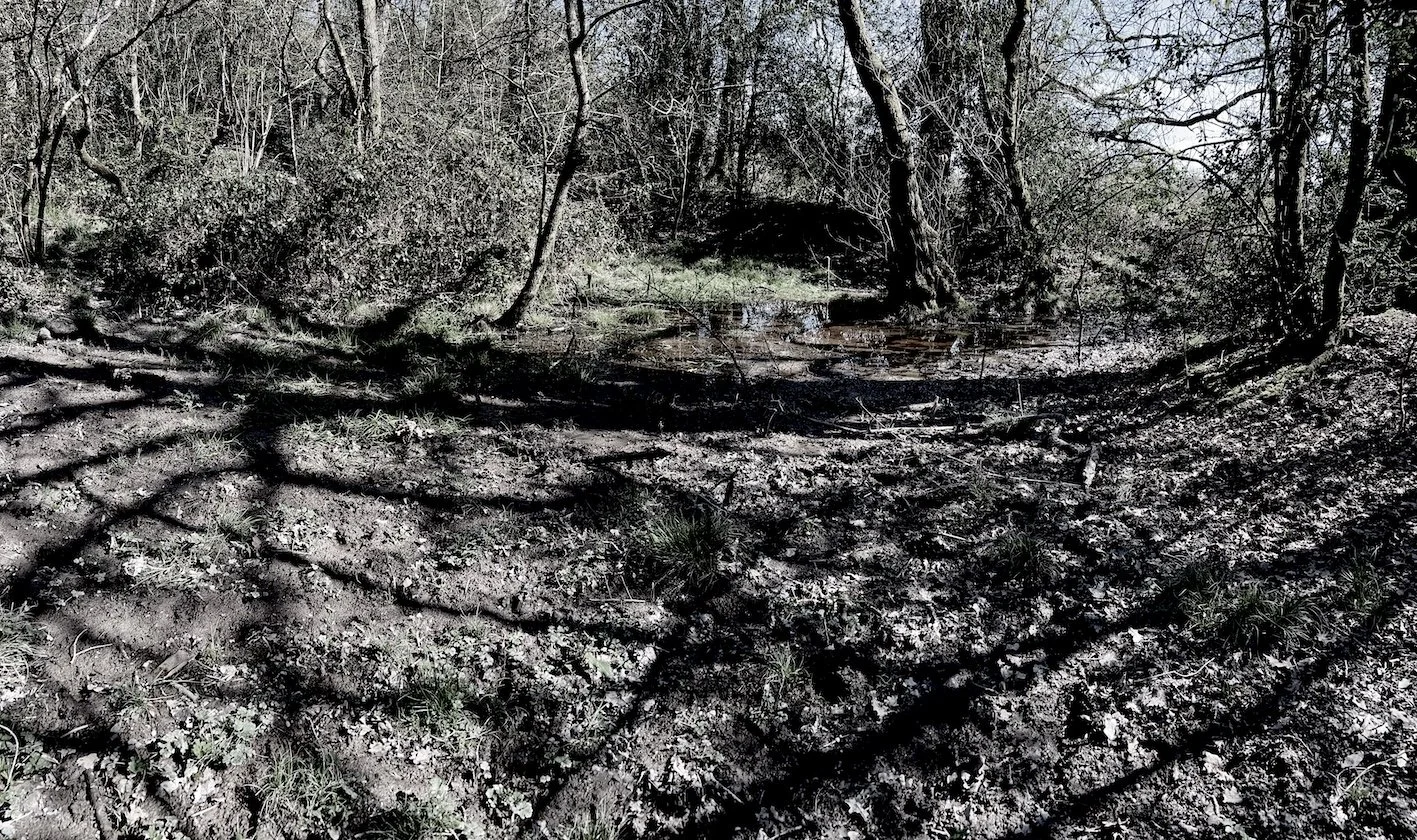 My wellies sink deep into brown oozing mud; it’s an effort to pull them out and remain upright, so I’m rather glad I have the stick. Walking slowly in a circle around the pond, I stir up pale sediment, obscuring patches of light blue sky and cloud, and dark trees reflected on the surface, patterns ripple, tiny bubble rise.