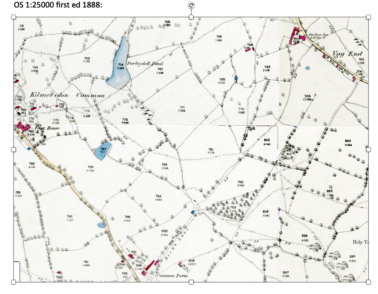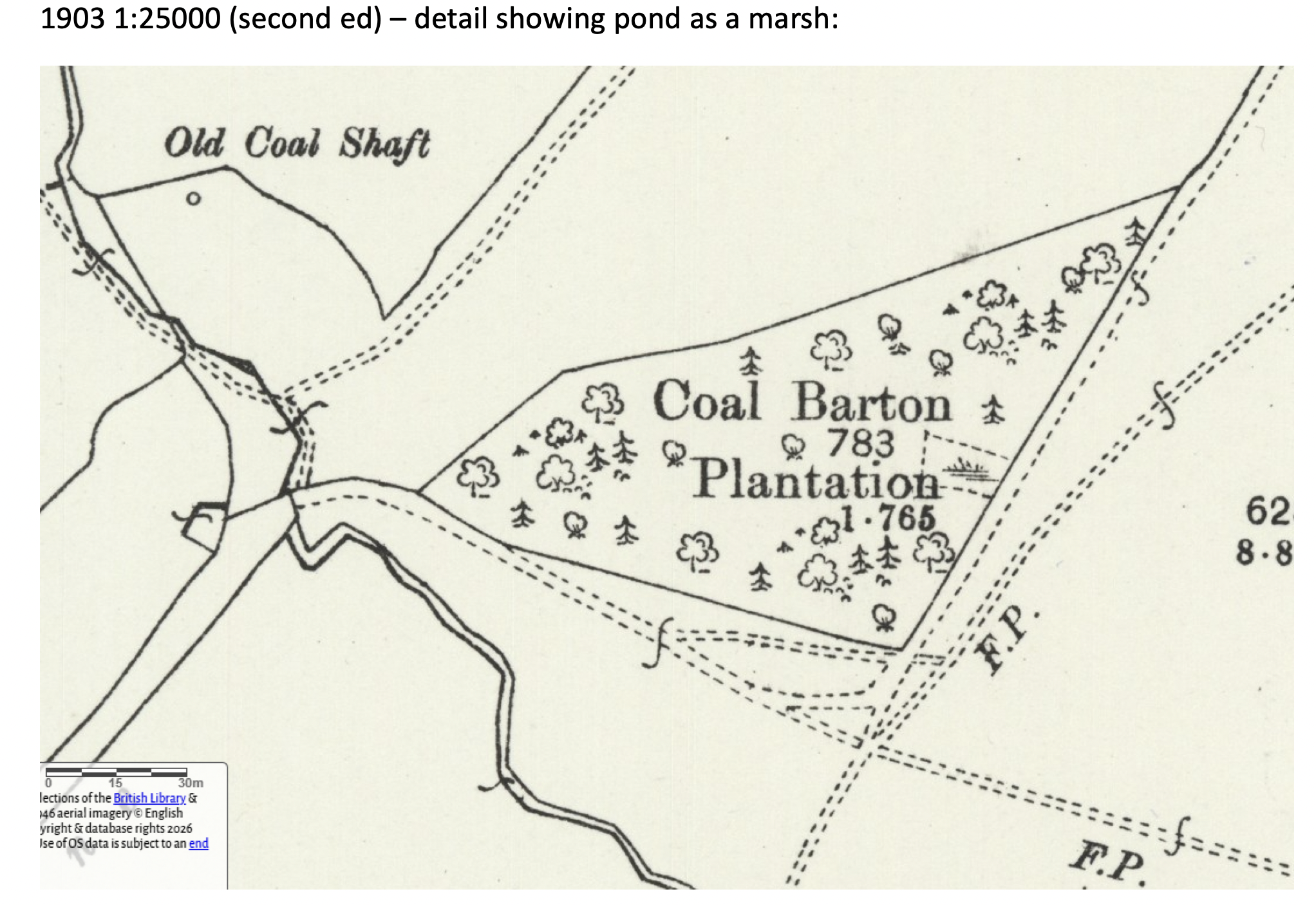 Then we find a 1903 map and this marks an old coal shaft and the plantation with this same rectangular area marked as ‘marshy’. This is my pond, even if it’s now a smaller hollow than it once was; embankments still surround it and right now there is water in it.