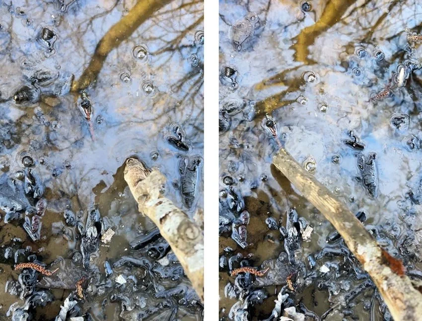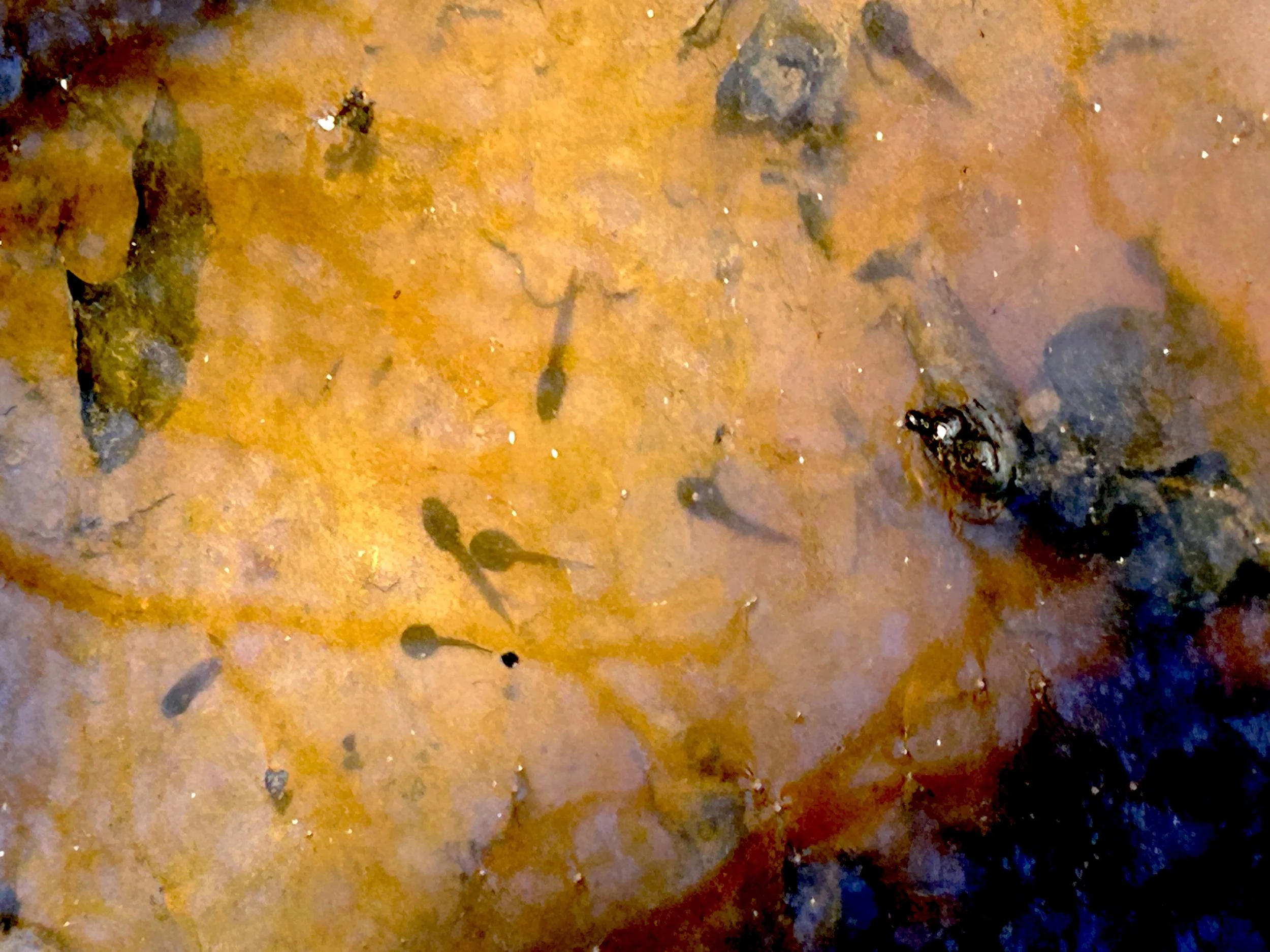 I’m back at the pond for a brief visit and find lots more tadpoles - hurrah! The sun warming the water seems to have brought them out of wherever they were lurking on my visit a couple of weeks ago. They’re still such tiny fragile emerging lives; I watch them wriggling through their watery world, glimpse them hanging motionless amongst decaying vegetation.