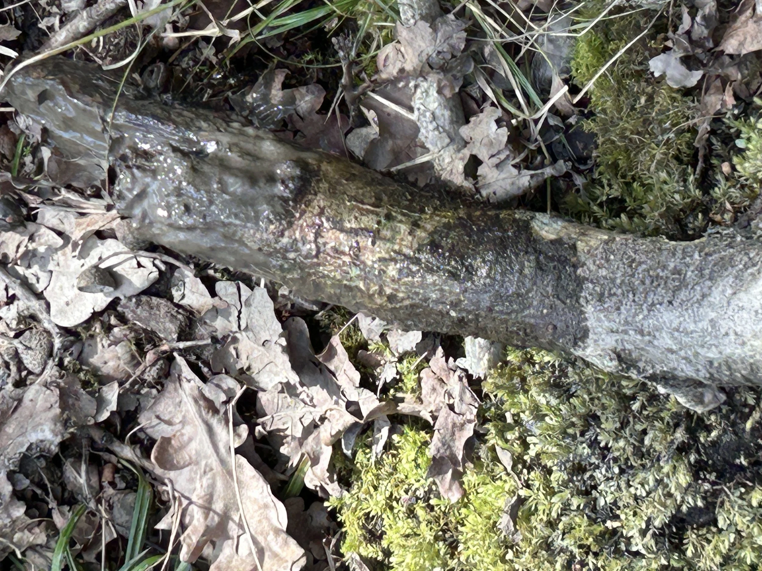 It’s still pretty wintery looking. Light through the trees is soft, pale sun trying to emerge through a still grey sky. The remaining leaves hanging on the trees drip with rain. The ground is slippery with black decaying leaves and twigs blown down from the trees in the recent winds.
