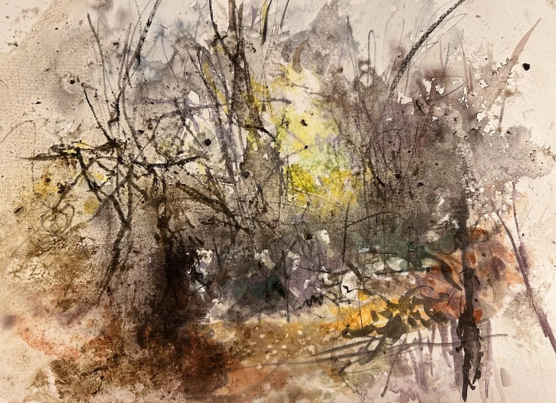 Coal Barton Wood, Coleford. Drop downhill into a valley and there’s a small wood with a tiny stream running through it. Hidden amongst the trees lies an inconspicuous pond, surrounded by brambles and saplings. A trickle of water feeding it can just be seen under the foliage. I’ve chosen this place because it’s somewhere little visited and often unnoticed. It has its own boundaries of raised banks enclosing it; walking around it takes less than 5 minutes, despite struggling to extricating myself from brambles and stinging nettles, ducking under tree branches, and wading through deep sucking mud. Once used by a mine, historical maps (1840s tithe map and 1880s OS 6 inch 1st edition), show buildings of which nothing now remains. It seems that the pond was once larger; presumably it's become silted up since the trees were planted or perhaps they just arrived there as seeds blown by the wind, and grew. I intend to visit the pond throughout the year, note changes, pond dip, measure the changing water height, identify plants growing around and in the water. Sitting inconspicuously, hidden from a nearby footpath by the surrounding trees, I will watch, draw, paint, photograph, listen, record sounds, and play.