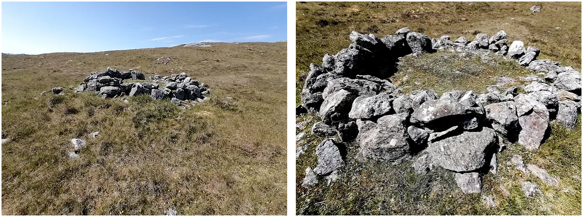 As we arrive below the cairn a Great Skua (Bonxie) circles overhead watching, swooping close, then landing on the hillside, then taking to the sky again. We suddenly realise that it has a young one – still featherless – well hidden in the grass, and we make a detour away from it before climbing to the top of the cairn. Standing surveying the landscape, we see the Bonxie is hunting; below us is a goose with a brood wandering about in the grass. The Bonxie makes a sudden dive and grabs at one of the small goslings – they all scatter in panic and the mother rushes to defend her children. Another dive; surely it’s got one? The problem (or perhaps the saving grace) is that Bonxies don’t have claws and can’t carry off their prey (their feet are webbed), so it comes away with nothing, but it’s difficult to see what’s going on. There’s a third fast dive down to the ground, and it looks as if there is impact, but the mother goose has got there and is defending her chicks. A black-back gull arrives and decides to intervene and attacks the bonxie, which takes to the air, flying off to sit on the far (our next destination) cairn. We have just witnessed nature in action.
